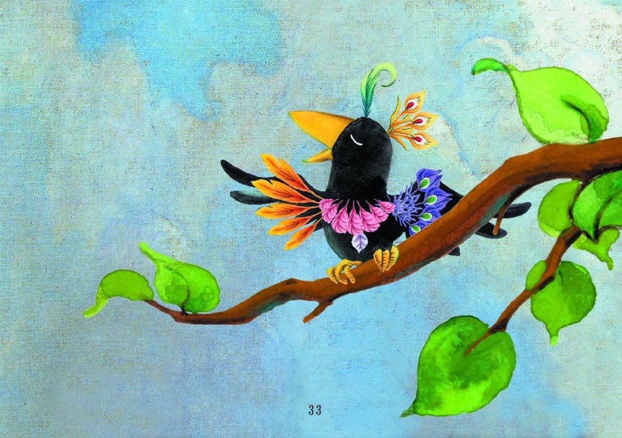 Lời kể: Ngày xưa, trong một khu rừng rậm cổ có rất nhiều chim chóc trú ngụ. Màu sắc của chúng rực rỡ, đẹp như những đám mây trong thế giới tự nhiên. Một hôm, chúng quyết định tổ chức một đại hội sắc đẹp, bầu chọn ra một con chim khác biệt với những con khác, sống chân thành hòa thuận với láng giềng, đồng thời mang thiên tính hòa bình của loài chim để làm đại sứ thân thiện. Sau khi tin tức truyền ra, những chú chim trong khu rừng đều phấn khích trang điểm, duy chỉ có quạ đen cảm thấy bản thân xấu xí nên không ngừng khóc thút thít. Bỗng nhiên, nó nhìn thấy bên bờ sông có nhiều bộ lông vũ màu sắc rực rỡ, đó là lông của các chú chim khi tắm đã cởi bỏ ra. Quạ đen vui mừng quá đỗi, đem tất cả chúng choàng vào thân, và nó liền biến thành chú chim xinh đẹp nhất.