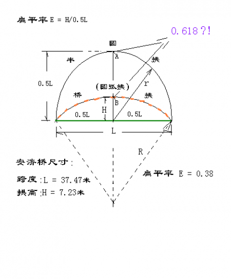 Nói đến lợi ích của việc “giảm độ cao cho vòm”, tôi muốn dẫn đến một tham số “tỉ lệ phẳng E” (thực tế thì cổ nhân không có cách nói như thế này, mà là một kiểu tư duy còn kỳ diệu hơn). Tỉ lệ phẳng E được tính bằng cách lấy chiều cao H của vòm chia cho một nửa chiều dài của nhịp cầu 0,5L. Giá trị thu được từ phép tính này sẽ nằm trong khoảng từ 0 – 1, thông thường giá trị này càng nhỏ thì cấu trúc cầu vòm càng tốt, như vậy chiều cao vòm cầu sẽ thấp, chiều dài cầu cũng sẽ ngắn, tiết kiệm vật liệu, trọng lượng nhẹ, áp lực nhỏ, nhưng giá trị này nếu bằng 0 thì lại không được, sẽ không phải là vòm nữa. Tuy nhiên nếu giá trị này thấp quá thì e rằng cũng không tốt, những khối đá có thể dễ bị rớt xuống, nên cần phải tính toán sao cho giá trị này ở điểm tối ưu. Cá nhân tôi cho rằng, về mặt tiếp xúc của các khối đá làm cấu trúc mái vòm phải thật chặt, lực ép trên dưới nên được chia đều, để tránh trường hợp đáng tiếc xảy ra. Độ cao của mái vòm cầu An Tế là H = 7,23m, chiều dài nhịp cầu chính là L=37,47m (có nơi nói là 37,04m), tỉ lệ phẳng E = 0,38. Tôi phát hiện, điểm giá trị 0,38 này, lại hầu như chính là phần bù của 0,618 trong khoảng từ 0 đến 1, tức là khoảng cách giữa đỉnh vòm bán nguyệt đến “vòm vòng cung” là 0,618! Đây chính là “điểm vàng”! Làm sao lại vừa khéo như vậy?