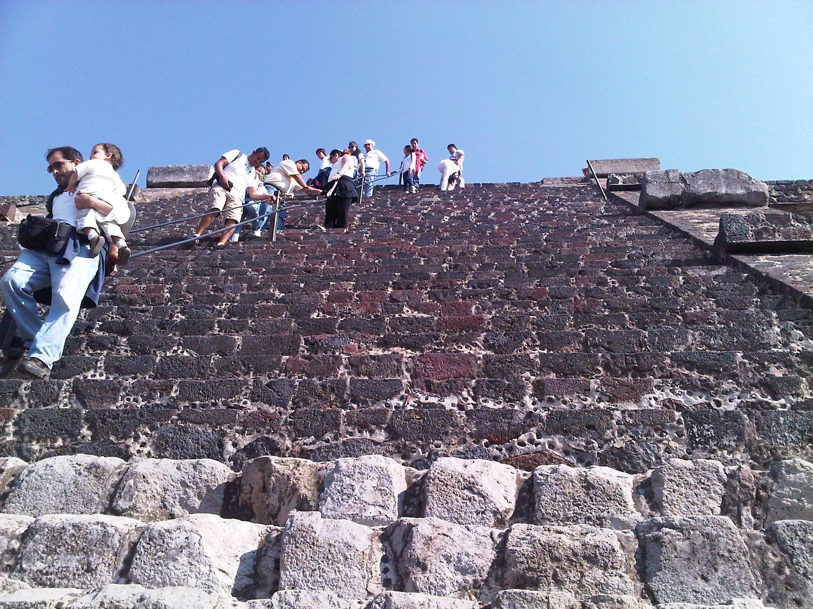 Điều thú vị là, mỗi bậc thang trên Kim tự tháp đều rất cao, chiều cao ít nhất phải gấp hai lần bậc đá thông thường, vì vậy trong bức ảnh này (Ảnh 3), mọi người đều phải vịn mà lên xuống rất khó khăn. Tôi đoán phải những người cao trên 2.5 mét dùng bậc thang thế này sẽ thấy thoải mái hơn, nhưng bất kể là người Teotihuacan hay người Aztec đều có chiều cao trung bình. Lẽ nào người Teotihuacan thời viễn cổ có thân hình cao lớn hơn chúng ta? Hay là có mục đích khác ?