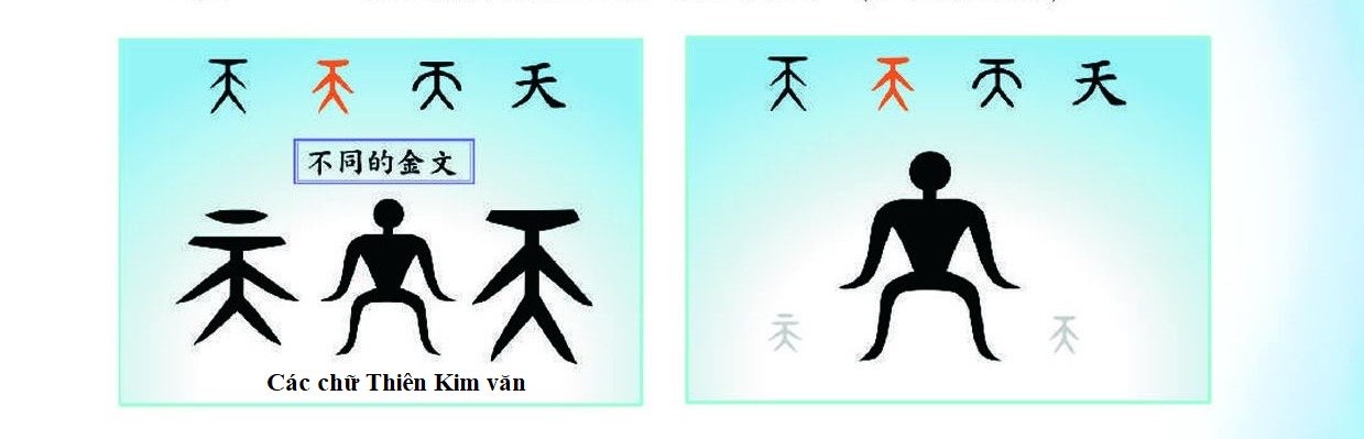 Chữ thứ tư, phần đầu bị ép xuống thành khối dẹp dẹp, gống như một mảng trời rồi. Nhưng mà chữ kim văn về cơ bản là chiểu theo giáp cốt văn, chỉ khác là nét bút đã dày hơn. Chữ thiên kim văn thứ 2 tựa như một người đứng thẳng cao cao (hình bên phải), như đỉnh thiên lập địa, viết ra tuy là hình người nhưng lại có một lão thiên.