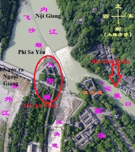 Có thể thấy, theo thiết kế vào mùa lũ sẽ có bốn phần lượng nước được điều tiết vào Nội Giang, nhưng khi thế lũ quá lớn, dù đã có Bảo Bình Khẩu hạn chế dòng chảy, nhưng nước lũ vẫn sẽ làm mực nước dâng cao, vậy nên mới cần đến Phi Sa Yển để gạn bớt cát đá và lượng nước, cũng như đê chữ Nhân (đập xả lý) phụ trợ xả lũ. Vị trí của đê chữ Nhân ở đầu Nam của Phi Sa Yển (hạ lưu), phía Tây Ly Đôi. Theo hiểu biết của tôi, tác dụng của đê chữ Nhân là: một là tác dụng phòng hộ, ngăn phòng nước trong Nội Giang chảy vào Ngoại Giang, ở đoạn từ Phi Sa Yển đến tận Bảo Bình Khẩu có thế năng nước, áp lực nước, lưu lượng nước rất lớn, Bảo Bình Khẩu lại cách cửa dưới Phi Sa Yển 120m, đồng thời do Bảo Bình Khẩu cản dòng nước, nên ở đoạn này hình thành một vùng nước xoáy (Phúc Long Đàm); hai là có lần xả lũ thứ hai (không để nước lại chảy ngược về Phi Sa Yển), xả lượng nước dư thừa men theo đê chữ Nhân vào Ngoại Giang (dòng chính của Mân Giang); ba là tránh ứ đọng, khiến bùn cát được gạn bỏ, tránh việc bùn cát làm ứ tắc, khiến nước sông chảy từ Bảo Bình Khẩu hướng về phía Đông huyện Quan không còn nhiều bùn cát, dòng nước rất trong sạch. Đê chữ Nhân phụ trợ cho Phi Sa Yển, cả hai đều không thể thiếu. Nếu nói đến tác dụng phòng hộ của đê chữ Nhân, thì hoàn toàn không phải là cấu trúc tường đê chắn cao theo cách “Nghiêm phòng tử thủ”.