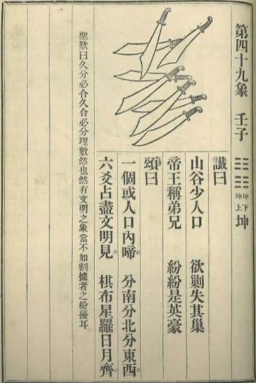 Hình vẽ minh họa của tượng rất đơn giản, có tám con dao sắp xếp theo thứ tự từ trên xuống dưới, rõ ràng tác giả Lý Thuần Phong muốn diễn đạt chính là “八刀”, và khi hai chữ này tổ hợp lại là một câu đố chữ đơn giản, đáp án chính là chữ 分 (phân). Báo hiệu thể chế Trung Quốc trong tương lai sẽ là hình thức liên bang hoặc liên minh. Kỳ thực triều Hạ, Thương, Chu thời Trung Quốc cổ đại chính là hình thức liên bang hoặc liên minh cổ đại: có một chính quyền trung ương làm chủ chung của thiên hạ, chính quyền địa phương là các nước chư hầu có các quyền tự trị khác nhau. Hoa Kỳ hiện nay cũng là thể chế liên bang: mỗi tiểu bang đều là một quốc gia tương đối độc lập, có hiến pháp riêng. Thể chế Trung Hoa sẽ tiến tới liên bang hoặc liên minh, trên bề mặt sẽ trải qua một quá trình phân ly, nhưng tương lai sẽ là tươi sáng.