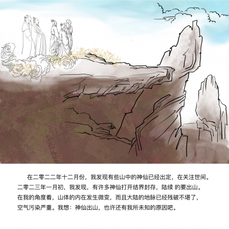 Trong tháng 12 năm 2022 tôi phát hiện ra đã có một số Thần Tiên trên núi xuất định và đang quan sát thế gian. Đầu tháng 01 năm 2023, tôi phát hiện có rất nhiều Thần Tiên đã mở phong ấn, đả khai kết giới, lần lượt xuất sơn. Từ góc độ của tôi mà nhìn, bên trong những ngọn núi đã có những thay đổi nhỏ, hơn nữa địa mạch của Đại Lục cũng đã có những tổn hại không thể phục hồi được nữa, không khí bị ô nhiễm nghiêm trọng, tôi nghĩ: Thần Tiên xuất sơn, có lẽ còn có một số nguyên nhân mà tôi không biết.