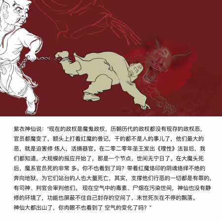 Vị mặc áo bào tím nói: “Chính quyền hiện giờ là chính quyền ma quỷ, chính quyền của các triều đại trong lịch sử không có chính quyền nào tà ác như hiện nay, quan chức đều bị ma biến rồi, trên trán đều có thú ký của ma đỏ, những gì họ làm không còn là con người nữa, tội ác lớn nhất của họ là bức hại người tu luyện, mổ cướp nội tạng. Sau khi Thánh Vương công bố Pháp chỉ “Lý Tính” vào năm 2020, chúng tôi đều biết, báo ứng trên quy mô lớn đã bắt đầu, đó chính là thời điểm mà thế gian không còn ngày nào an toàn nữa. Sau khi đại ma đầu chết, những quan chức tà ác chết rất nhiều. Ngài chẳng phải cũng nhìn thấy rồi sao? Những âm hồn mang dấu ấn ma đỏ không ngừng rơi xuống địa ngục, những người đồng lõa với chúng cũng bị chết theo với số lượng lớn, kỳ thực những người chống đỡ cho họ hành ác đều là có tội, có phán quan, tư Thần sẽ thẩm phán họ. Hiện tại độc tố, khói, xác chết trong không khí đang làm ô nhiễm thế gian, Thần Tiên cũng không còn hoàn cảnh để tĩnh tu nữa rồi, công năng cũng không thể che chắn cho không gian mà bản thân phong ấn nữa rồi, tro bụi thời mạt thế đang không ngừng rơi, chẳng phải mắt thịt của ngài cũng nhìn thấy sự biến đổi của không khí rồi sao?”