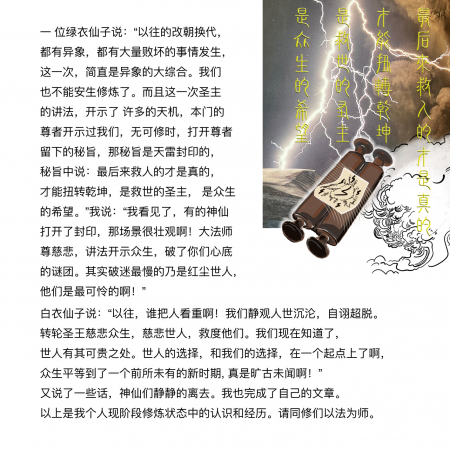 Một vị áo xanh nói: “Trước đây, mỗi khi thay đổi triều đại đều có dị tượng, đều có phát sinh rất nhiều những việc bại hoại, lần này, có thể nói là tổng hợp của rất nhiều những dị tượng lớn. Chúng tôi cũng không thể an định mà tu luyện rồi. Hơn nữa lần này Thánh Chủ giảng Pháp đã khai thị rất nhiều thiên cơ, Tôn Giả của bản môn chúng tôi đã từng khai thị cho chúng tôi, là lúc không thể tu luyện trong pháp môn của chúng tôi nữa, thì hãy mở mật chỉ mà Tôn Giả lưu lại cho chúng tôi, mật chỉ bị thiên lôi phong ấn, trong mật chỉ nói: Người cuối cùng đến cứu người mới là thật, mới có thể xoay chuyển càn khôn, là Thánh Chủ cứu thế, là hy vọng của chúng sinh”.
