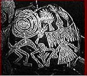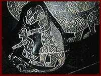 Trong số đó có một phiến đá có khắc hình một người đàn ông hoảng loạn đang bị một con khủng long bạo chúa (Tyrannosaurus Rex) truy đuổi, anh ta rất sợ hãi chạy về phía trước. Con khủng long bạo chúa này trông giống với khủng long bạo chúa mà chúng ta đã từng xem trong bộ phim “Công viên kỷ Jura” (Jurassic Park), là một loài khủng long đứng với hai chân sau rất lực lưỡng, trong khi hai chân trước lại rất ngắn giống như chậm phát triển, dường như rất không cân xứng với thân hình to lớn của nó. Ngày nay khi các chuyên gia khai quật hóa thạch khủng long, sau khi phân loại và sắp xếp cẩn thận, họ đã dựa vào phương pháp phục hồi để ghép lại bộ xương ban đầu, rồi lại dựa trên những suy đoán hợp lý để phác họa hình dáng của loài khủng long vào thời đó. Từ đó suy ra rằng, người đã khắc lên những viên đá này, nếu không phải đã sống cách đây hơn một trăm triệu năm, vậy thì rõ ràng họ cũng có kiến thức ngang hàng với các nhà khoa học ngày nay, có thể vẽ lại hình ảnh khủng long bằng cách khôi phục hóa thạch.