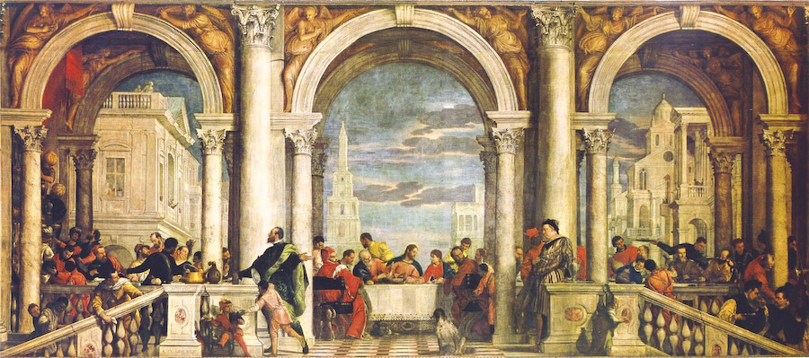 “Bữa tiệc trong nhà Levi” (The Feast in the House of Levi) được vẽ bởi Paolo Veronese năm 1573, 555×1280 cm, hiện lưu trữ tại phòng trưng bày Accademia (Gallerie dell’Accademia) ở Venice. Phái hội họa Ý không bao giờ quên truyền thống vẽ tranh bích họa quy mô lớn. Vào thế kỷ 16, người Venice bắt đầu vẽ những bức tranh sơn dầu khổng lồ trên canvas để thể hiện niềm đam mê nghệ thuật vô hạn của họ. Tác phẩm tiêu biểu của Veronese “Bữa tiệc trong nhà Levi” mô tả cảnh “Bữa tối cuối cùng” trong Kinh thánh, nơi Chúa Jesus vạch trần sự ngụy thiện của Judas. Đối với chủ đề này, khi sáng tác tranh các họa sĩ khác thường sử dụng lối vẽ nghiêm túc, thận trọng, thể hiện cảm xúc bi phẫn, nhưng Veronese lại mô tả rất nhiều cảnh rộng rãi, khoáng đạt. Toàn bộ bức tranh cao khoảng 5,5 m, dài gần 13 m, khí thế hùng tráng, huy hoàng, bức tranh sơn dầu này cùng với bức tranh “Tiệc cưới ở Cana” (The Wedding Feast at Cana) của ông được mệnh danh là những bức tranh sơn dầu cổ điển có kích thước lớn nhất thế giới.