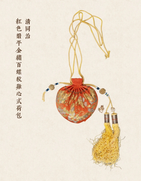 Chữ trên tranh: “清同治 紅色缎平金繡百蝶紋雞心式荷包” (Chiếc ví hình trái tim, hoa văn bách điệp thêu kim tuyến trên vải lụa màu đỏ thời vua Đồng Trị (Thanh Mục Tông) nhà Thanh)