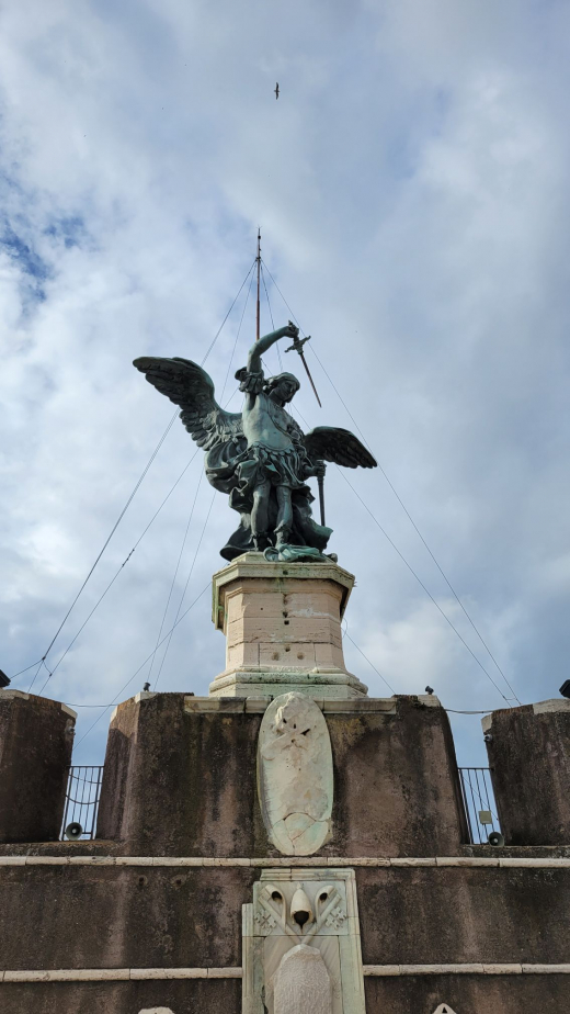 Bức tượng Thánh Thiên Thần Michael trên đỉnh tòa lâu đài. (Ảnh: Charlie Lu/The Epoch Times)