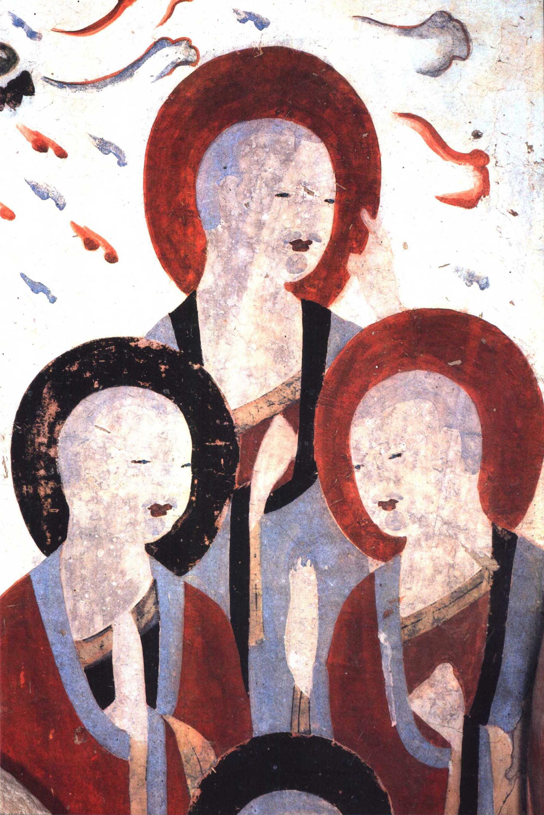 Ba vị đệ tử trong hang Mạc Cao số 280. Dường như chỉ với vài mảng màu đã khiến hình ảnh ba vị đệ tử của Phật hiền hòa, chân thành hiện lên trước mắt; đám trẻ ở hang số 23, hình bóng của chúng được tạo ra một cách ngẫu hứng bằng những nét vẽ phóng khoáng thô sơ, nhưng lại thể hiện rất sinh động sự tinh nghịch, hồn nhiên của đám trẻ đang chơi đùa.