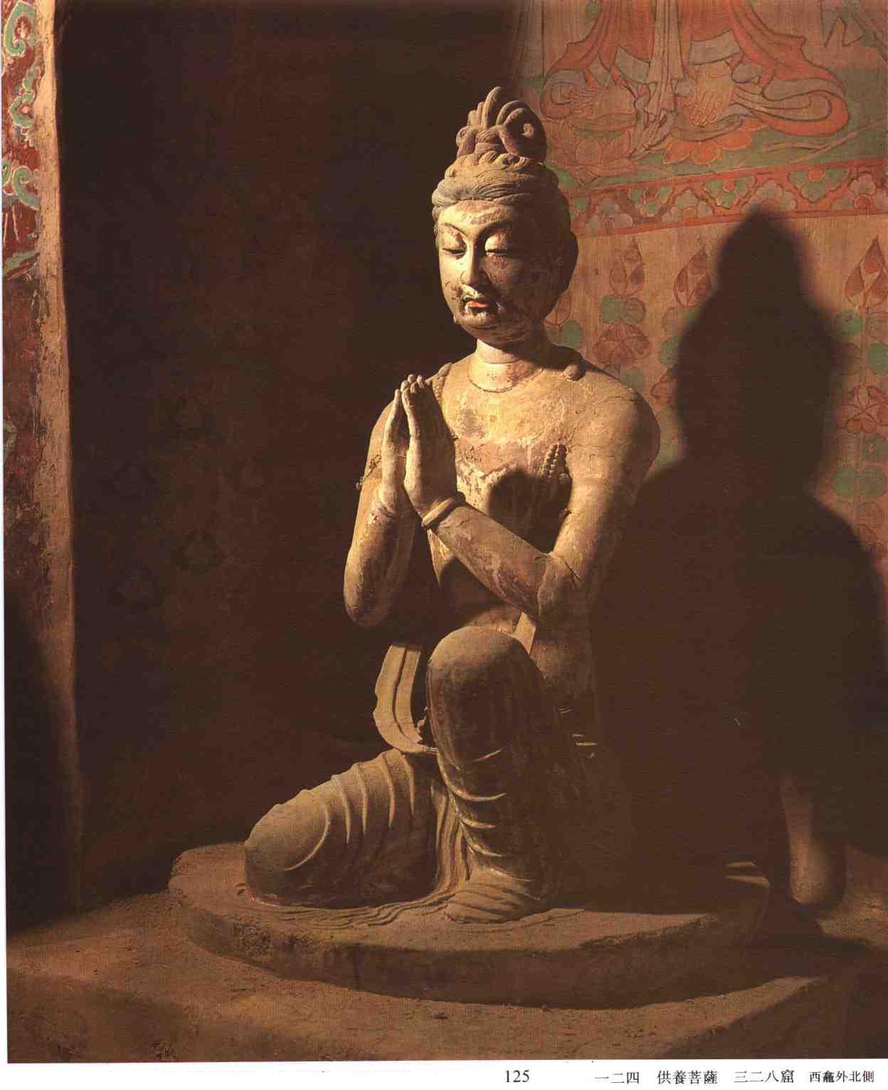 Tượng Bồ Tát hồ quỳ (tư thế nửa ngồi nửa quỳ) ở hang Mạc Cao 328, tư thế hồ quỳ của bức tượng này là tác phẩm duy nhất ở Đôn Hoàng, nó là hiện thân của lòng thành kính.