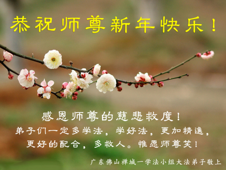 Các đệ tử Đại Pháp ở điểm học Pháp của Thiền Thành thành phố Phật Sơn thuộc Quảng Đông cung chúc Sư Tôn từ bi vĩ đại năm mới vui vẻ!