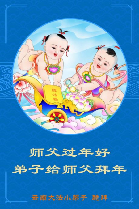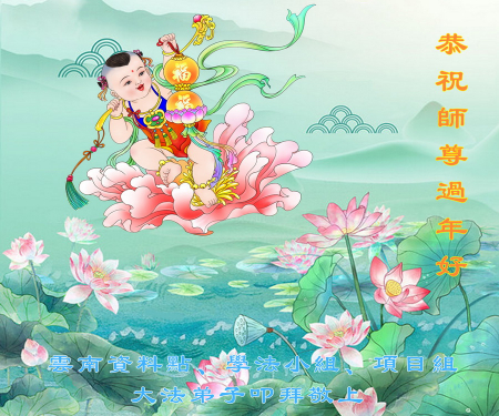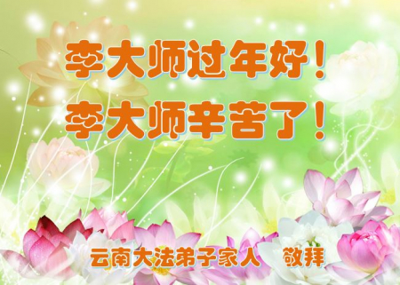 Toàn thể các đệ tử Đại Pháp và người trong gia đình ở Vân Nam gửi lời chúc mừng tới Sư phụ vĩ đại từ bi! Kính chúc Sư phụ năm mới vui vẻ! Sư phụ vất vả rồi! Cảm ơn sự khổ độ từ bi của Sư phụ! Chúng con phải triệt để phủ định và thanh trừ tà ác hiện nay đang tấn công và bôi nhọ một cách điên cuồng ngang ngược và độc ác vào Đại Pháp, Sư phụ Đại Pháp và Thần Vận. Trong những ngày cuối cùng khi Pháp Chính Nhân Gian đến, chúng con đệ tử Đại Pháp ở Vân Nam nhất định phải theo kịp tiến trình Chính Pháp của Sư phụ và phối hợp với nhau để làm tốt ba việc của đệ tử Đại Pháp theo yêu cầu của Sư phụ: học Pháp tốt, học Pháp nhiều hơn và thực hành Pháp, hướng nội tìm, tu tốt bản thân, giảng chân tướng nhiều hơn, giảng tốt chân tướng, cứu được nhiều người hơn và thực hiện lời thề tiền sử của mình. Sư phụ hãy yên lòng! Toàn thể đệ tử Đại Pháp tỉnh Vân Nam xin kính bái!