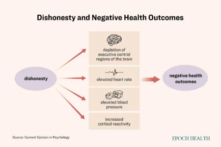 Các vấn đề sức khỏe do không trung thực gây ra. Từ trên xuống dưới: Sự không trung thực dẫn đến suy giảm chức năng điều hành; nhịp tim tăng nhanh; tăng huyết áp; và tăng mức cortisol. Tất cả những điều này đều có tác động tiêu cực tới sức khỏe. (Ảnh minh họa bởi The Epoch Times)