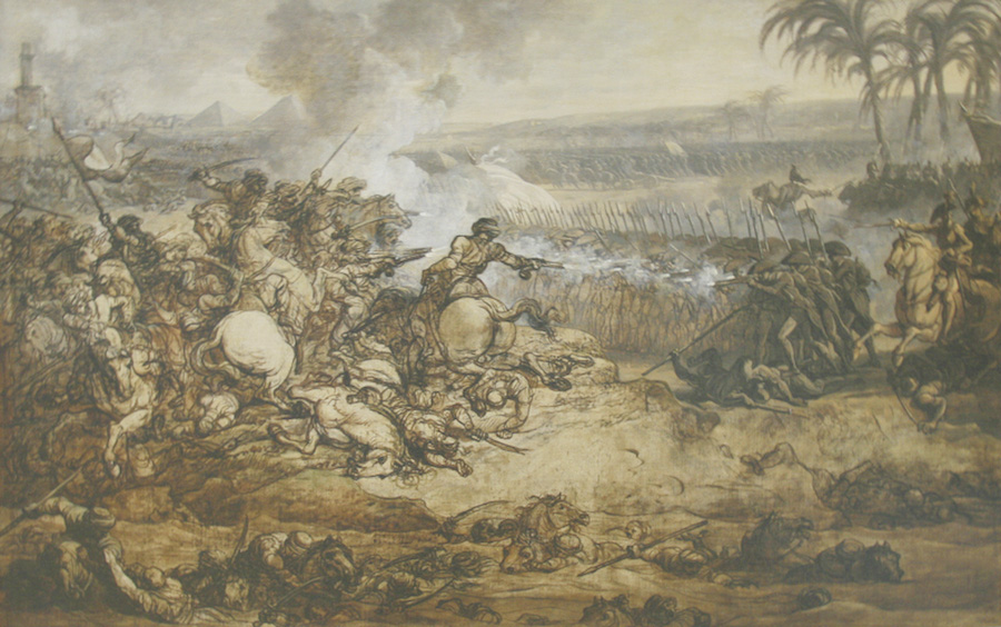Cũng trong năm 1801, họa sỹ tại Paris, Pháp là François-André Vincent đã vẽ tác phẩm còn dang dở này, tác phẩm mang tên “La bataille des Pyramides” (Trận chiến của các Kim tự tháp). Qua bức tranh có thể thấy phần cận cảnh của tác phẩm vẫn là những đường viền phác họa hình khối, trong khi tác giả đã bắt đầu sử dụng kỹ thuật làm trắng những phần sáng ở khu vực viễn cảnh, từng bước mở rộng cục bộ, dần dần hoàn thành miêu tả viễn cảnh. Kỹ thuật vẽ từng bước cụ thể theo phương pháp trước tiên vẽ hình khối cơ bản, sau đó vẽ viễn cảnh, rồi đến cảnh cận cảnh này giúp đơn giản hóa những thứ cần xem xét ở mỗi bước, khiến cho việc vận dụng kỹ thuật lưu loát hơn. Tác phẩm này hiện đang lưu trữ tại Bảo tàng Louvre.