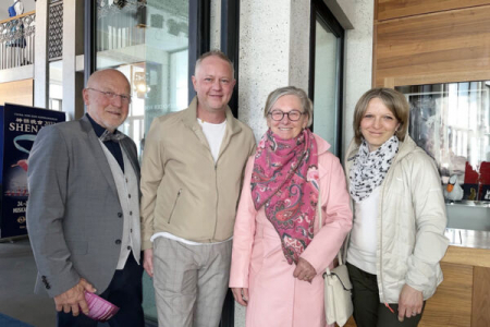 Bà Monika Einsiedler (thứ hai từ phải sang) là chủ một nhà hàng nổi tiếng, đã cùng chồng, ông Tobias Einsiedler (đầu tiên từ trái sang), con gái Katja van Baßhuisen (đầu tiên từ phải sang) và con rể Christoph van Baßhuisen (thứ hai từ trái sang) đã đến xem biểu diễn. (Ảnh: An Ran/The Epoch Times)