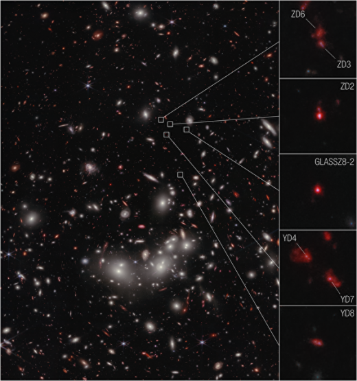 Bảy cụm thiên hà nguyên thủy từ thời vũ trụ sơ khai được kính viễn vọng không gian Webb chụp lại. (Nguồn: NASA, ESA, CSA, Takahiro Morishita [IPAC], Alyssa Pagan [STScI])