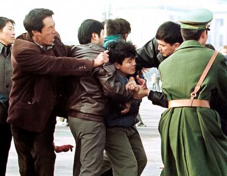Các học viên Pháp Luân Công thỉnh nguyện ôn hòa tại Quảng trường Thiên An Môn vào năm 1999, nhưng gặp phải sự đối xử thô bạo của công an.