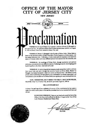 Thị trưởng thành phố Jersey, New Jersey, trở thành thị trưởng đầu tiên trên thế giới tuyên bố “Ngày Đại sư Lý Hồng Chí” kể từ khi ông Giang Trạch Dân bắt đầu cuộc bức hại Pháp Luân Công vào ngày 20/07/1999.