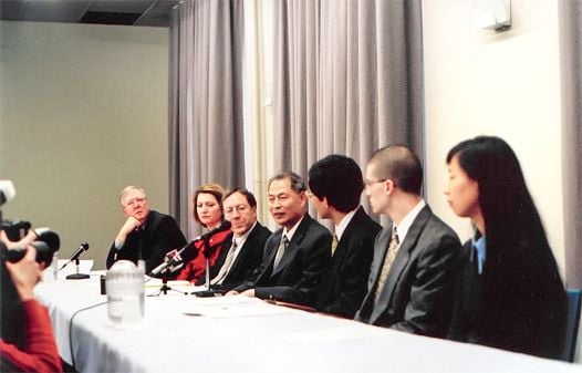 Giáo sư Trương Côn Luân (thứ 4 từ trái qua), vừa được giải cứu khỏi Trung Quốc và trở về Canada, bày tỏ lòng biết ơn tới tất cả những người đã ủng hộ ông, tại một cuộc họp báo ở Montréal vào ngày 19/01/2001.