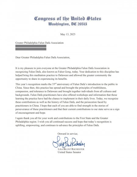 Vào dịp trước Ngày Pháp Luân Đại Pháp Thế giới 13/05/2025, Hiệp hội Pháp Luân Đại Pháp khu vực Philadelphia đã nhận được thư chúc mừng và tuyên dương từ các chính khách ở nhiều cấp chính quyền thuộc bang Pennsylvania và Delaware. Trong thư, họ bày tỏ sự cảm ơn và ghi nhận những lợi ích mà Pháp Luân Đại Pháp đã mang lại cho người dân trong khu vực cũng như trên toàn thế giới.