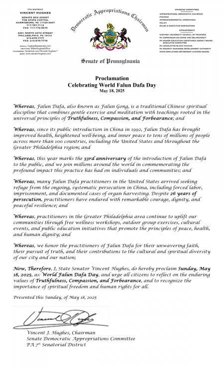 Ông Vincent Hughes – Chủ tịch Ủy ban phân bổ ngân sách Đảng Dân chủ Thượng viện bang Pennsylvania, Thượng nghị sĩ của khu vực bầu cử thứ 7, đã gửi thư tuyên dương đến Hiệp hội Pháp Luân Đại Pháp khu vực Philadelphia, nhân dịp Ngày Pháp Luân Đại Pháp Thế giới.