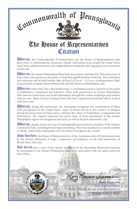 Hạ viện bang Pennsylvania trao tặng bằng khen, do Hạ nghị sĩ Mary Isaacson của khu vực bầu cử số 175 bang Pennsylvania khởi xướng, nhân dịp Ngày Thế giới Pháp Luân Đại Pháp, cảm ơn các học viên Pháp Luân Đại Pháp vì đã hồng truyền các nguyên lý “Chân – Thiện – Nhẫn” ra thế giới.