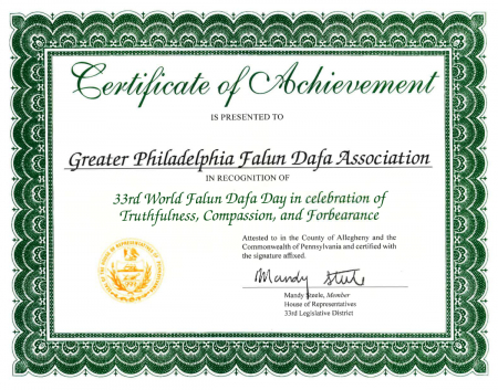 “Hạ viện bang Pennsylvania nhân dịp kỷ niệm 33 năm Ngày Pháp Luân Đại Pháp Thế giới, cùng chung vui trong sự kiện hàng năm này, một sự kiện đầy hy vọng, thiện lương và khoan dung”.