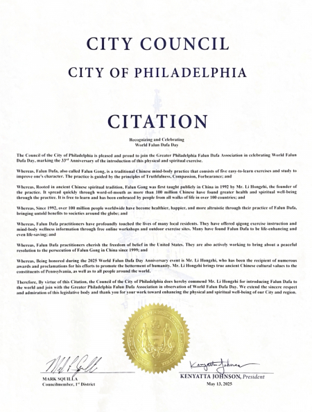 “Hội đồng Thành phố Philadelphia vô cùng vinh dự được cùng Hiệp hội Pháp Luân Đại Pháp Philadelphia kỷ niệm Ngày Pháp Luân Đại Pháp Thế giới, đánh dấu 33 năm môn tu luyện cả thân và tâm này được truyền ra thế giới”.