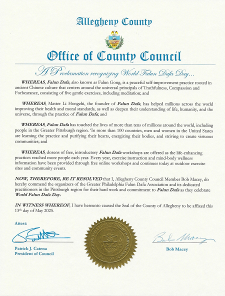 Ông Patrick J. Catena – Giám đốc hành chính Quận Allegheny, bang Pennsylvania, và ông Bob Macey – Hạ nghị sĩ quận, đã ký tên trao tặng bằng khen Ngày Pháp Luân Đại Pháp Thế giới, “Xin trân trọng tôn vinh Hiệp hội Pháp Luân Đại Pháp khu vực Philadelphia và các học viên của họ tại khu vực Pittsburgh, cảm ơn những nỗ lực và tinh thần cống hiến mà họ đã thể hiện nhân dịp kỷ niệm Ngày Pháp Luân Đại Pháp Thế giới”.