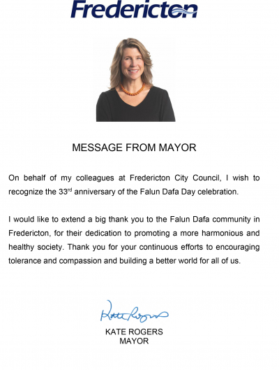 Thị trưởng thành phố Fredericton, bà Kate Rogers, thay mặt các đồng nghiệp trong Hội đồng Thành phố, chân thành chúc mừng “Ngày Pháp Luân Đại Pháp” và chào mừng 33 năm Pháp Luân Đại Pháp được truyền ra thế giới.