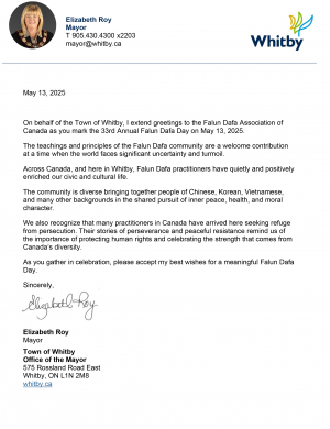 Thị trưởng thị trấn Whitby, bà Elizabeth Roy, thay mặt thị trấn Whitby, gửi lời chào trân trọng đến Hiệp hội Pháp Luân Đại Pháp Canada và chúc mừng các học viên Đại Pháp nhân dịp lễ kỷ niệm “Ngày Pháp Luân Đại Pháp”.