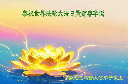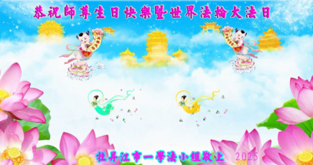 Nhân dịp chào mừng ngày Pháp Luân Đại Pháp lần thứ 26 sắp đến gần, chúng con kính dâng lên Sư phụ lời chúc nguyện chân thành nhất, kính chúc Sư phụ sinh nhật vui vẻ! Trong một ngày thần thánh vĩ đại này, chúng con lại càng thêm nhớ mong Sư tôn, những điều mà Sư tôn vĩ đại đã chịu đựng, đã hy sinh, đệ tử không biết dùng ngôn ngữ nào để hình dung biểu đạt. Vào thời khắc khi tấm màn của thời Pháp Chính Nhân Gian đang được kéo mở, chúng đệ tử chỉ duy có dũng mãnh tinh tấn, tuân theo lời dạy của Thầy, làm tốt ba việc, mau cứu người, cứu nhiều người, đoái hiện thệ ước, theo Thầy về nhà. Cảm tạ Sư tôn!