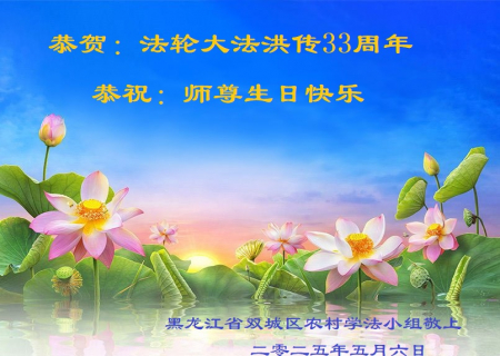Đệ tử Đại Pháp thuộc nhóm học Pháp tại khu Tân Nam Cương, thành phố Cáp Nhĩ Tân kính chúc Sư tôn vĩ đại sinh nhật vui vẻ!
