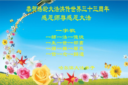 Cảm ân Sư tôn đã vớt đệ tử từ trong địa ngục, tẩy tịnh để con trở thành đệ tử chính Pháp, ban cho đệ tử cơ thể khỏe mạnh và tâm thái bình hòa. Đệ tử tu luyện Pháp Luân Đại Pháp hơn 20 năm vẫn chưa được tận mắt nhìn thấy Sư tôn, nhưng những gì Sư tôn ban cho đệ tử có dùng hết những ngôn từ của nhân loại cũng không kể hết Sư ân hạo đãng! Sư tôn Ngài vất vả rồi, cảm tạ ân Sư!