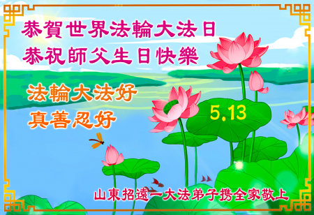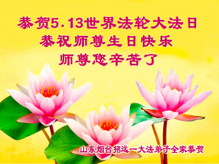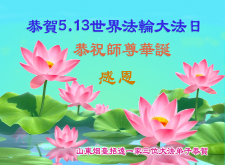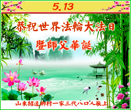 Một đệ tử Đại Pháp cùng gia đình ở Chiêu Viễn, Yên Đài, Sơn Đông kính chúc mừng Ngày Pháp Luân Đại Pháp Thế giới 13/5 và chúc mừng sinh nhật Sư phụ!