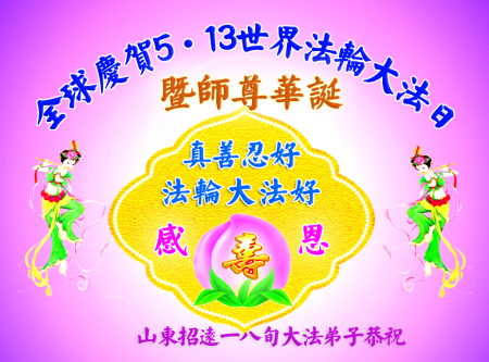 Đệ tử Đại Pháp tại Chiêu Viễn, Sơn Đông chúc mừng sinh nhật Sư phụ và chúc mừng Ngày Pháp Luân Đại Pháp Thế giới 13/5!