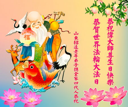Một đệ tử Đại Pháp ở Chiêu Viễn, Sơn Đông cùng toàn thể gia đình mười người chúc mừng Ngày Pháp Luân Đại Pháp Thế giới và kính chúc sinh nhật Sư phụ!