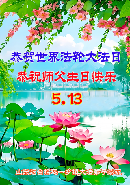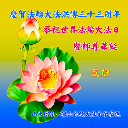Đệ tử Đại Pháp ở Chiêu Viễn, Yên Đài, Sơn Đông chúc mừng Ngày Pháp Luân Đại Pháp 13/5! Cung chúc Sư phụ sinh nhật vui vẻ!