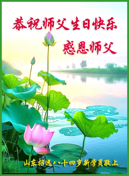 Học viên mới 84 tuổi tại trấn Chiêu Viễn, thành phố Yên Đài, tỉnh Sơn Đông cung chúc Sư phụ sinh nhật vui vẻ!