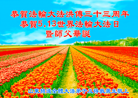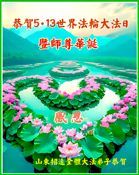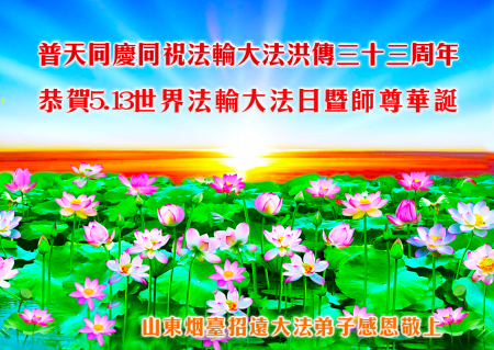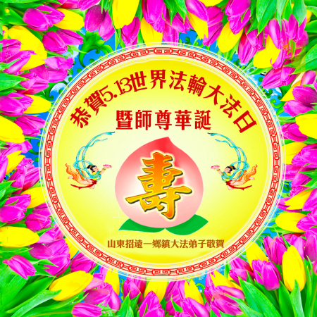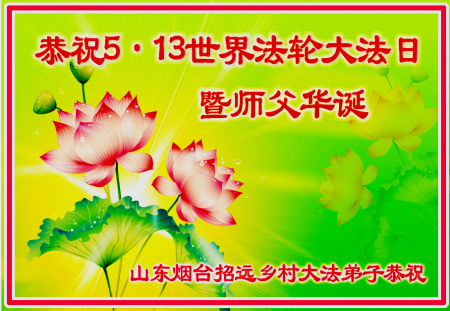 Đệ tử Đại Pháp trấn Chiêu Viễn, thành phố Yên Đài, tỉnh Sơn Đông kính chúc Ngày Pháp Luân Đại Pháp Thế giới 13/5 và sinh nhật Sư phụ!