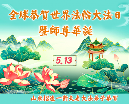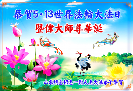 Vợ chồng đệ tử Đại Pháp tại trấn Chiêu Viễn, thành phố Yên Đài, tỉnh Sơn Đông chúc mừng Ngày Pháp Luân Đại Pháp Thế giới 13/5! Chúc mừng Sư tôn vĩ đại sinh nhật vui vẻ!