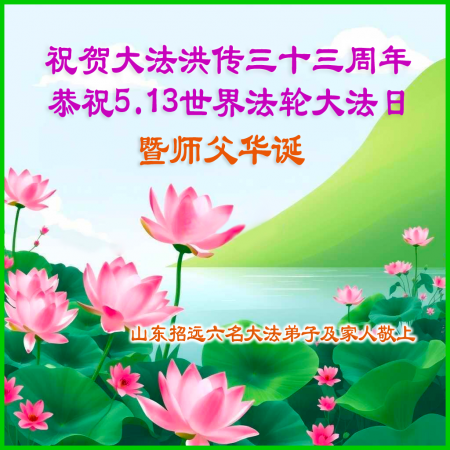Đệ tử Đại Pháp tại Chiêu Viễn, Sơn Đông cùng gia đình đã minh bạch chân tướng kính chúc Ngày Pháp Luân Đại Pháp Thế giới và chúc mừng sinh nhật Sư phụ!