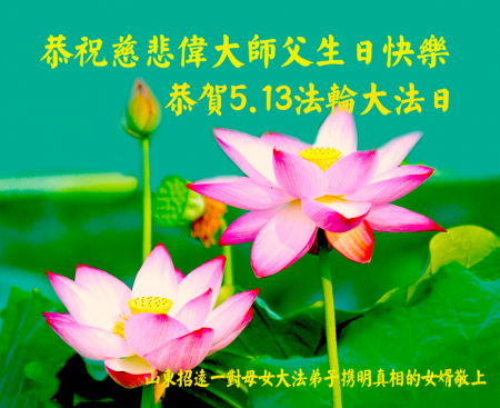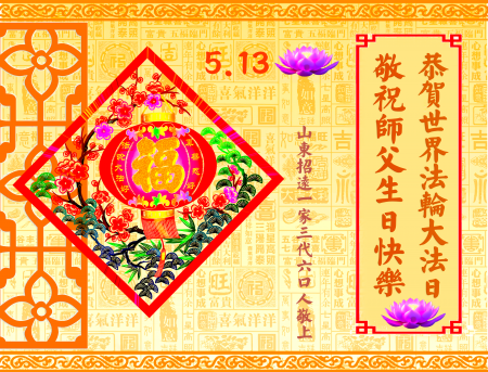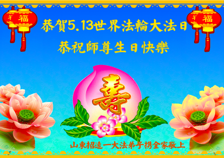 Một đệ tử Đại Pháp ở Chiêu Viễn, Sơn Đông cùng người nhà kính chúc mừng Ngày Pháp Luân Đại Pháp Thế giới 13/5 và chúc mừng sinh nhật Sư phụ!