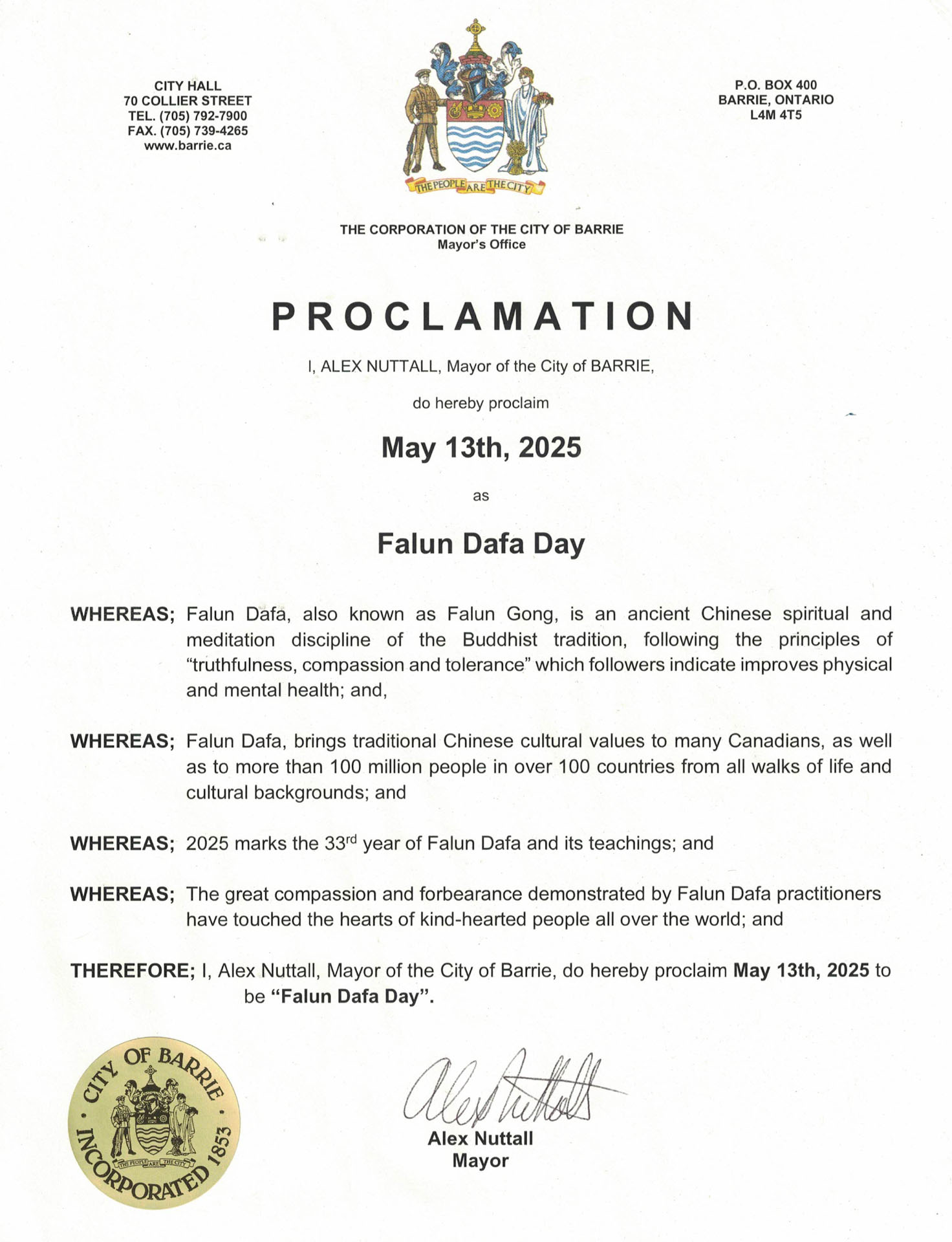 Vì vậy: Tôi, Alex Nuttell, Thị trưởng Thành phố Barrie, xin tuyên bố ngày 13/05/2025 là Ngày Pháp Luân Đại Pháp”.