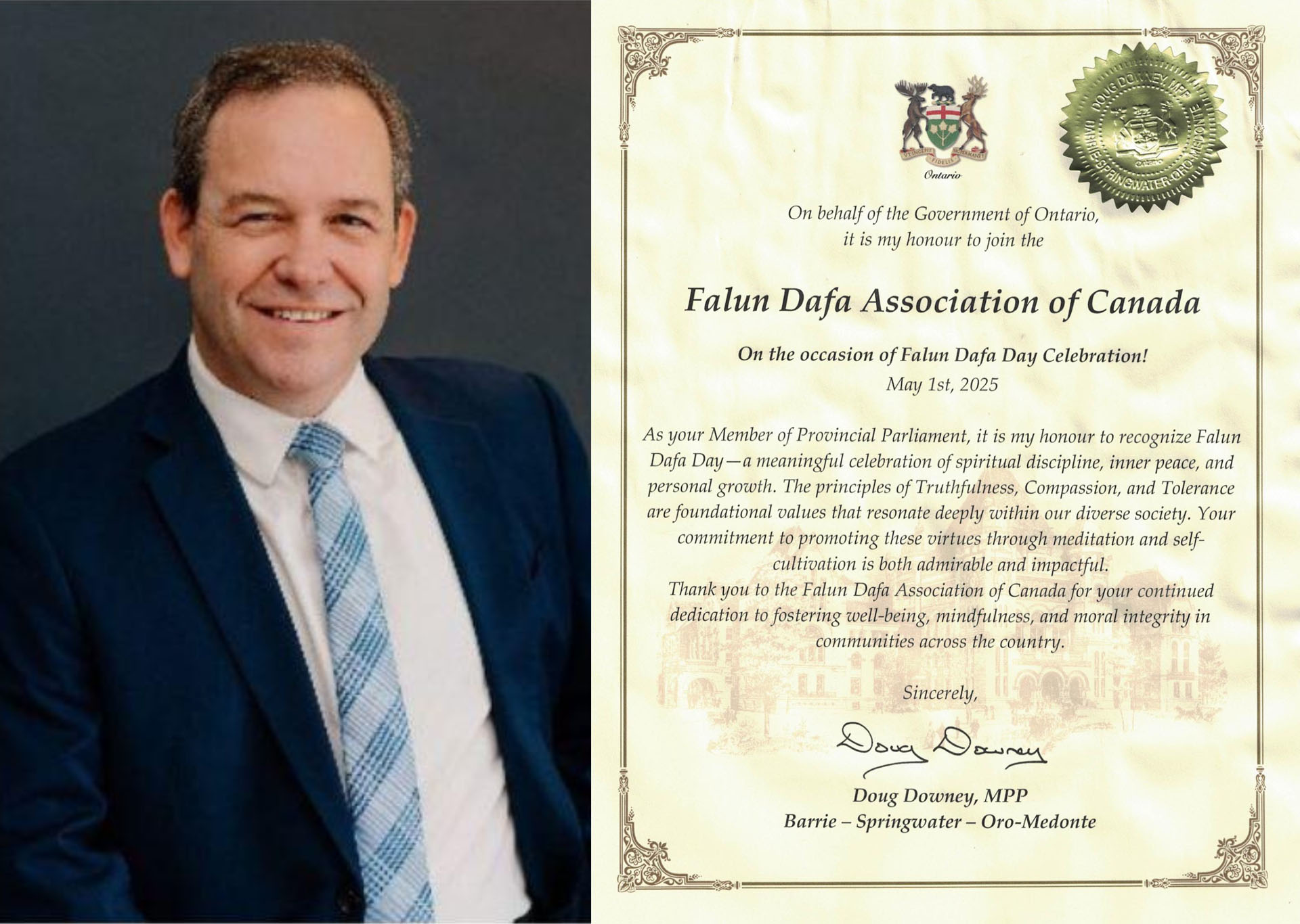 “Với tư cách là Nghị sĩ Quốc hội tỉnh Ontario khu vực bầu cử Barrie – Innisfil, tôi rất vinh dự được tham dự Lễ Thượng cờ Ngày Pháp Luân Đại Pháp vào ngày 01/05/2025;