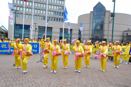 Vào ngày diễn ra Lễ Thượng cờ, trời đổ mưa như trút nước từ sáng sớm, nhưng khi buổi lễ bắt đầu, mưa đột nhiên tạnh, ánh nắng tươi sáng chiếu rọi Quảng trường Tòa thị chính Barrie. Đội trống lưng do các học viên Pháp Luân Công biểu diễn nổi lên những tiếng trống rộn rã, bầu không khí tại hiện trường trở nên vui tươi và tường hòa.