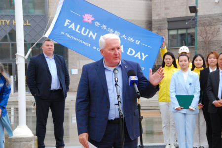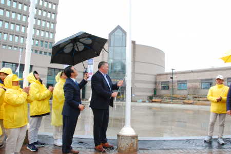 Vào ngày 01/05/2025, Thị trưởng thành phố Barrie, ông Alex Nuttall đã chủ trì Lễ Thượng cờ và đọc thư khen ngợi, tuyên bố ngày 13/05 là “Ngày Pháp Luân Đại Pháp” của thành phố. (Ảnh: Y Linh/The Epoch Times)