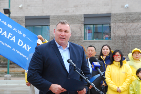 Vào ngày 01/05/2025, ông John Brassard, Đại biểu Quốc hội Liên bang tại Barrie South – Innisfil, đã ca ngợi Pháp Luân Đại Pháp mang một giá trị phổ quát. (Ảnh: Y Linh/The Epoch Times)