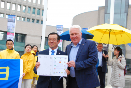 Thị trưởng thành phố Barrie, ông Alex Nuttall nhiệt tình phát biểu: “Cảm ơn sự hiện diện của quý vị, tại Tòa thị chính thành phố Barrie, chúng ta cùng nhau kéo lá cờ Ngày Pháp Luân Đại Pháp Thế giới lên để kỷ niệm điều mà Canada có thể làm được, nhưng Trung Quốc thì không – đó là tự do tu luyện, tự do sinh sống. Ở Barrie, quý vị có thể làm những gì mình muốn và có thể tổ chức các hoạt động kỷ niệm tại quảng trường công cộng này. Cảm ơn quý vị, đó cũng là vinh dự của chúng tôi!”